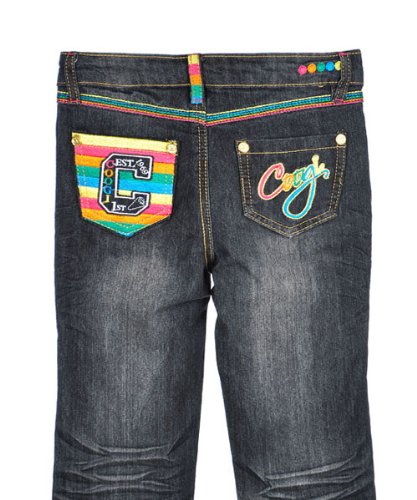 Give her summer look a splash of urban style with these colorful Coogi skinny jeans! They feature logo rivets and buttons, rainbow stitching highlights, and vibrant logo embroidery on the back pockets. The raw-style denim has light fading and wrinkle wear throughout. Check out our Coogi T-shirts to match! 98% Cotton, 2% Spandex Machine Wash Cold, Inside Out Made in China